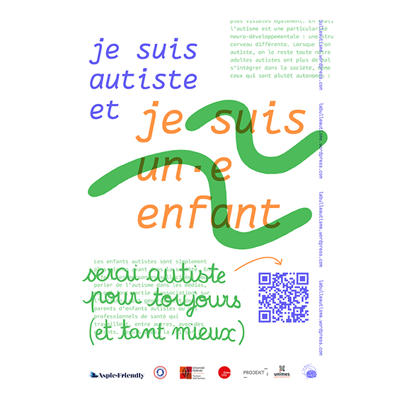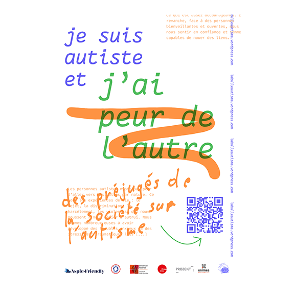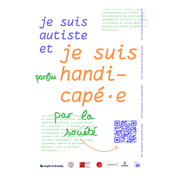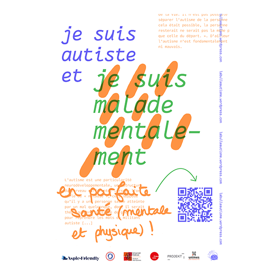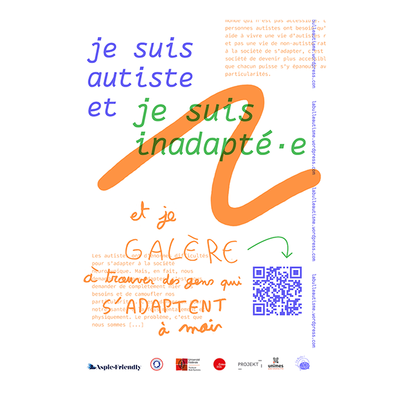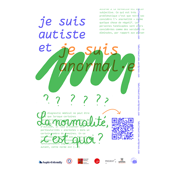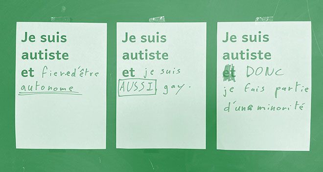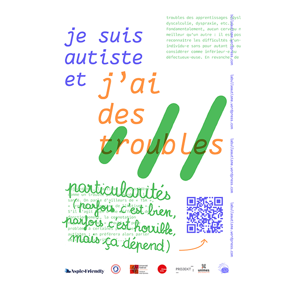 transcription audio Les premières expériences réflexives du projet Je suis autiste et … ont débuté en hiver 2021 par une mise en dialogue graphique des expériences autistiques vis-à-vis des discours portés à l'égard de l'autisme. Elles émanent de constats concernant les savoirs produits à l'égard de l'autisme échappant pour beaucoup aux personnes concernées qui pourtant se trouvent à l'origine du recueil de données. À l'encontre d'un processus usuel d'analyse de données, l'enjeu de ces « réactions graphiques » préliminaires est d'introduire un espace de partage entre personnes autistes. Il s'agit aussi d'engager la discussion à partir de mots recueillis via un questionnaire en ligne auprès d'universitaires (enseignants·es, étudiants·es, personnels administratifs) à propos de ce qu'ils pensent de l'autisme : → Citez trois mots que le terme « autisme » vous évoque spontanément. Ces mots venant compléter la phrase « je suis autiste et … » ont donné lieu à près d'une centaine de supports graphiques imprimés sur lesquels des étudiants et étudiantes autistes toulousains ont interagi graphiquement pour modifier, raturer, compléter, annoter, valider, ces phrases en dialogue avec leur propre expérience. Dans la volonté de diffuser ces réactions graphiques plus largement et produire un premier archivage de récits et de discours issus des savoirs d'expérience de personnes concernées, une sélection de 10 phrases a été effectué sur la base des phrases identifiées comme étant à la fois les plus récurrentes, et sur lesquelles les autistes ont le plus réagis. Cette sélection a par la suite donnée lieu à une campagne d'affichage portée par l'association #La Bulle !, soutenue par le projet Aspie-Friendly, le Crous Occitanie, et le laboratoire de recherche PROJEKT (UPR). La campagne s'est accompagnée d'un atelier de médiation sur le site de l'université de Toulouse - Jean Jaurès en décembre 2022. L'ensemble de la démarche du projet et le cadre de recherche dont il est issu sont détaillés et expliqués dans une édition numérique disponible au téléchargement : PDF je suis autiste et … Les 10 phrases sélectionnées ont fait l'objet d'un travail d'écriture des étudiants·es de l'association La Bulle !, destiné a accompagné les réactions individuelles des affiches d'un texte collectif reflétant une voix commune tout en soulignant des récits nuancés. L'ensemble de ces productions sont à découvrir ci-dessous ↓