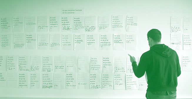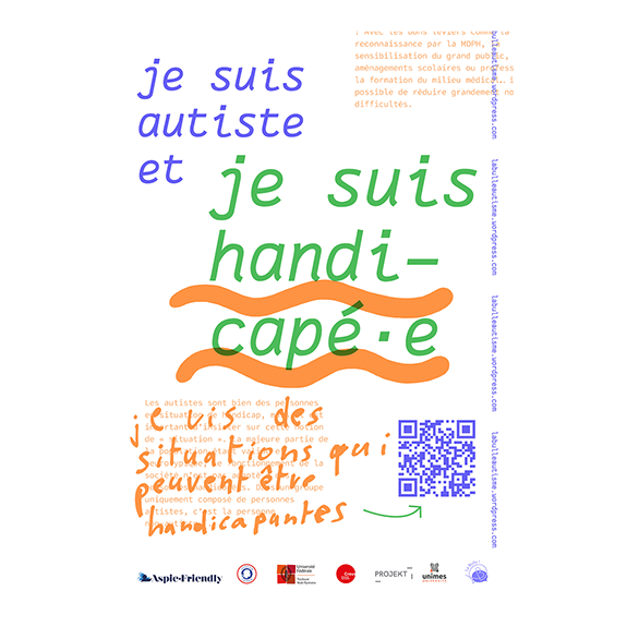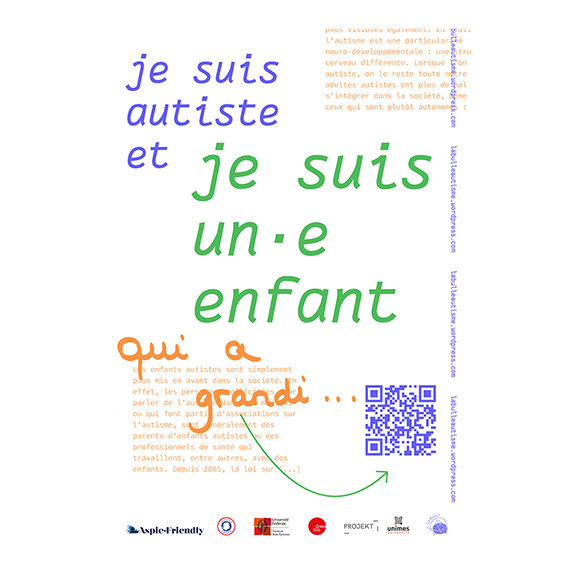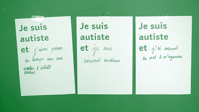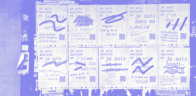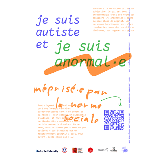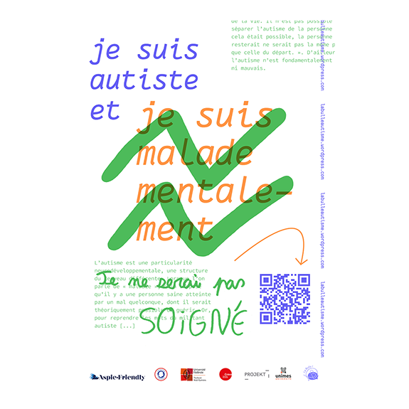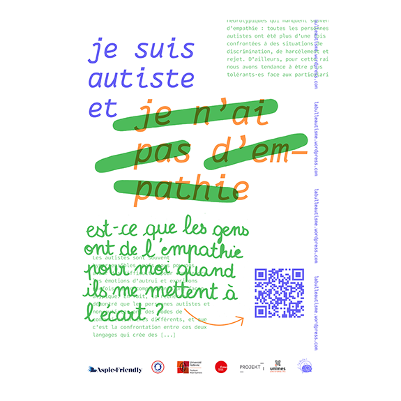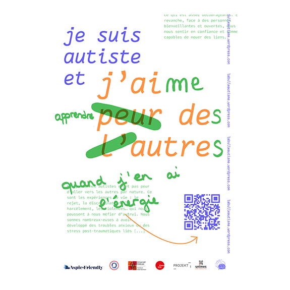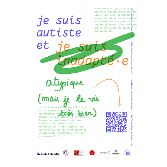 transcription audio Les premières expériences réflexives du projet Je suis autiste et … ont débuté en hiver 2021 par une mise en dialogue graphique des expériences autistiques vis-à-vis des discours portés à l'égard de l'autisme. Elles émanent de constats concernant les savoirs produits à l'égard de l'autisme échappant pour beaucoup aux personnes concernées qui pourtant se trouvent à l'origine du recueil de données. À l'encontre d'un processus usuel d'analyse de données, l'enjeu de ces « réactions graphiques » préliminaires est d'introduire un espace de partage entre personnes autistes. Il s'agit aussi d'engager la discussion à partir de mots recueillis via un questionnaire en ligne auprès d'universitaires (enseignants·es, étudiants·es, personnels administratifs) à propos de ce qu'ils pensent de l'autisme : → Citez trois mots que le terme « autisme » vous évoque spontanément. Ces mots venant compléter la phrase « je suis autiste et … » ont donné lieu à près d'une centaine de supports graphiques imprimés sur lesquels des étudiants et étudiantes autistes toulousains ont interagi graphiquement pour modifier, raturer, compléter, annoter, valider, ces phrases en dialogue avec leur propre expérience. Dans la volonté de diffuser ces réactions graphiques plus largement et produire un premier archivage de récits et de discours issus des savoirs d'expérience de personnes concernées, une sélection de 10 phrases a été effectué sur la base des phrases identifiées comme étant à la fois les plus récurrentes, et sur lesquelles les autistes ont le plus réagis. Cette sélection a par la suite donnée lieu à une campagne d'affichage portée par l'association #La Bulle !, soutenue par le projet Aspie-Friendly, le Crous Occitanie, et le laboratoire de recherche PROJEKT (UPR). La campagne s'est accompagnée d'un atelier de médiation sur le site de l'université de Toulouse - Jean Jaurès en décembre 2022. L'ensemble de la démarche du projet et le cadre de recherche dont il est issu sont détaillés et expliqués dans une édition numérique disponible au téléchargement : PDF je suis autiste et … Les 10 phrases sélectionnées ont fait l'objet d'un travail d'écriture des étudiants·es de l'association La Bulle !, destiné a accompagné les réactions individuelles des affiches d'un texte collectif reflétant une voix commune tout en soulignant des récits nuancés. L'ensemble de ces productions sont à découvrir ci-dessous ↓